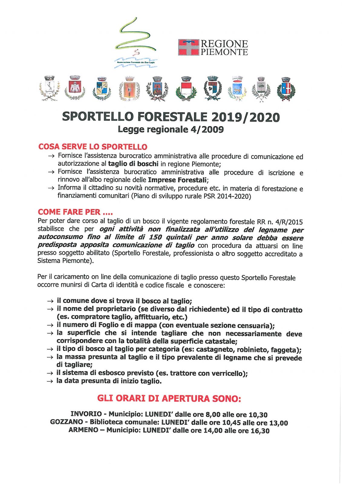 Con decorrenza 21/10/2019 verrà attivato, da parte dell'Associazione Forestale dei Due Laghi, uno Sportello Forestale presso i Comuni di Invorio, Gozzano ed Armeno.