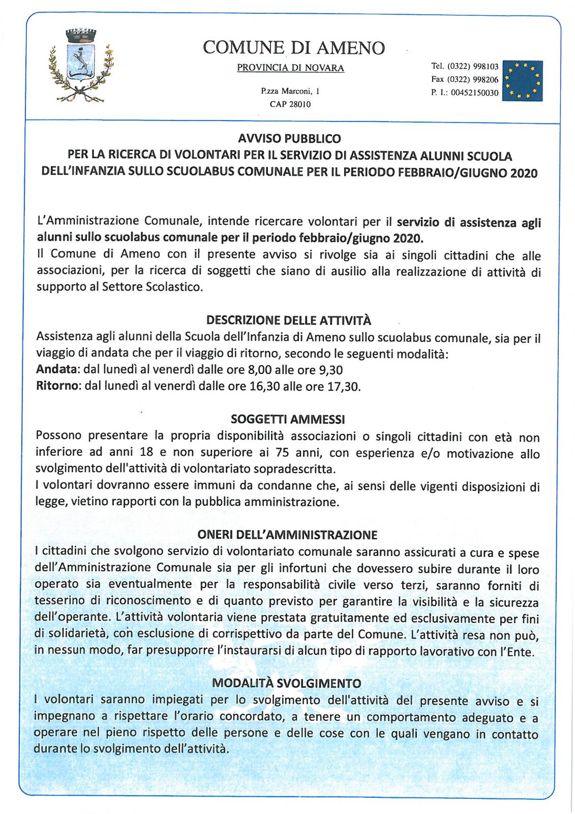 AVVISO PUBBLICO PER LA RICERCA DI VOLONTARI PER IL SERVIZIO DI ASSISTENZA ALUNNI SCUOLA DELL'INFANZIA SULLO SCOLABUS COMUNALE PER IL PERIODO FEBBRAIO/GIUGNO 2020.
