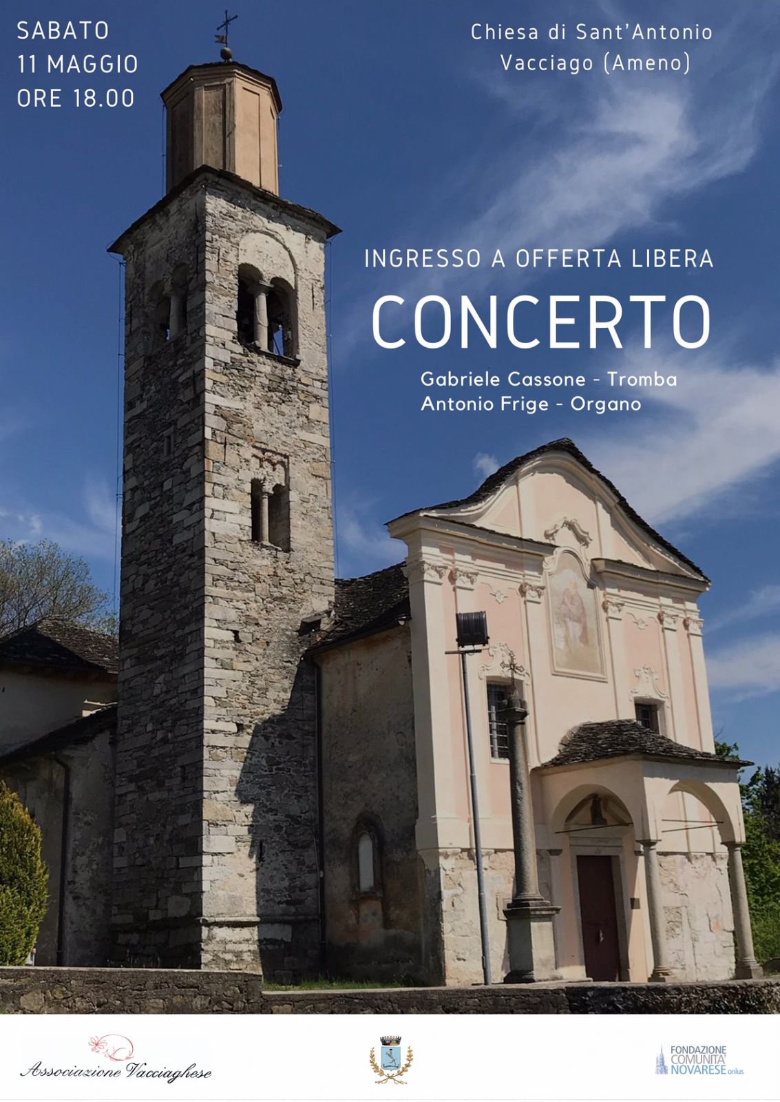 Sabato 11 MAGGIO alle ore 18:00 presso la Chiesa di Sant'Antonio di Vacciago di Ameno GABRIELE CASSONE e ANTONIO FRIGE terranno un concerto di tromba e organo organizzato dall'Associazione Vacciaghese.