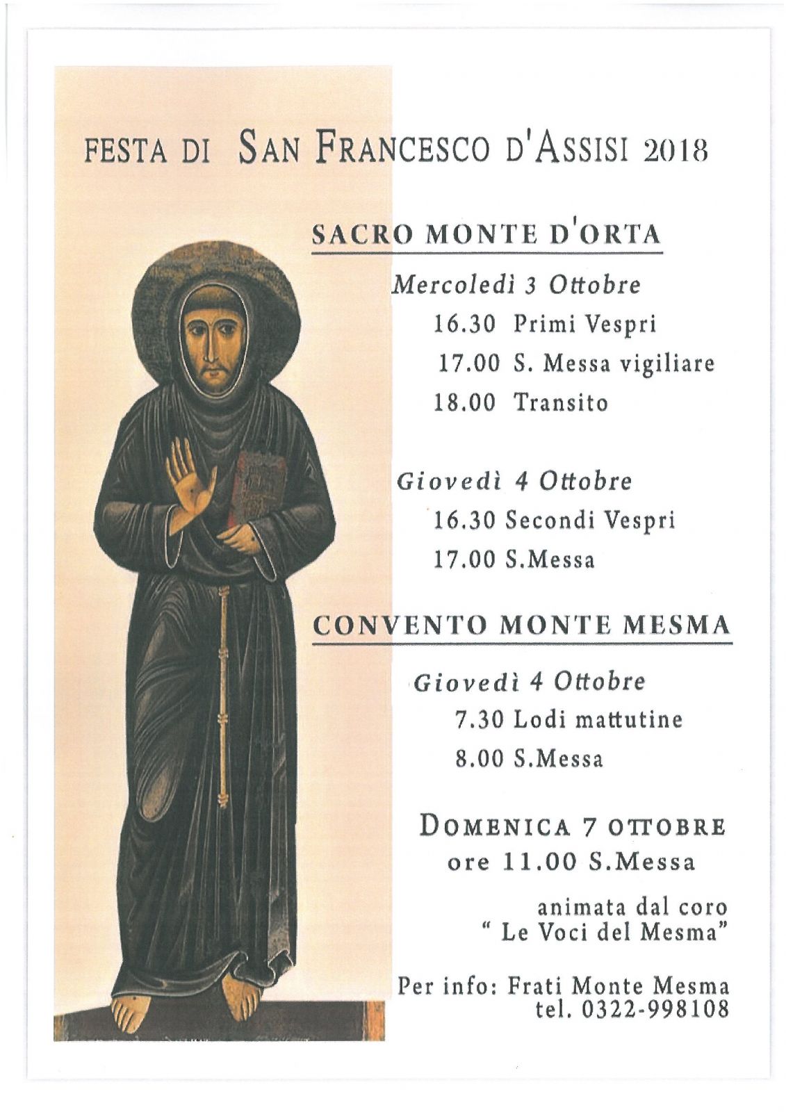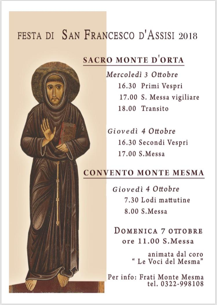Per info: Frati Monte Mesma tel. 0322 998108