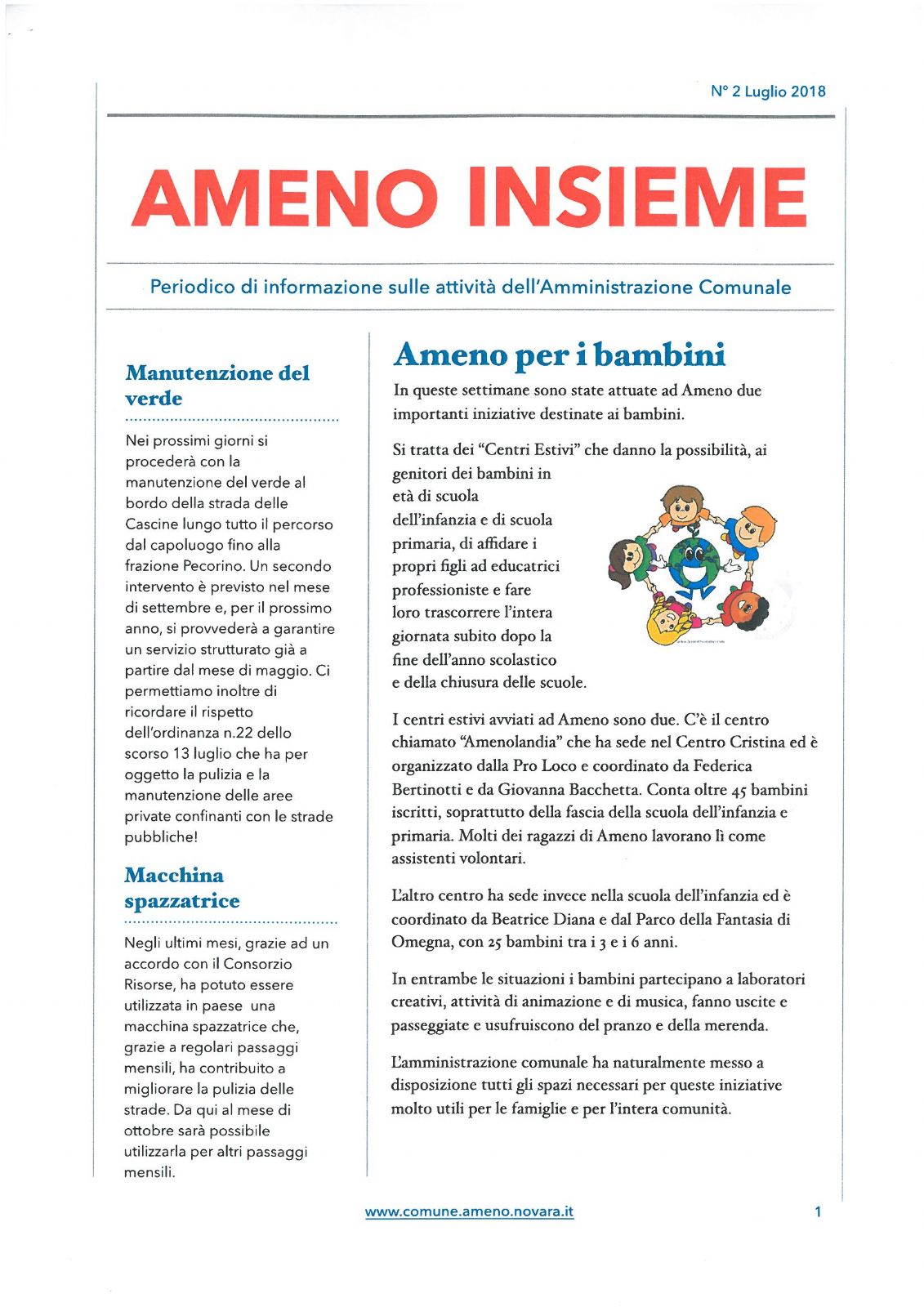 AMENO INSIEME - PERIODICO DI INFORMAZIONE SULLE ATTIVITA' DELL'AMMINISTRAZIONE COMUNALE - LUGLIO 2018