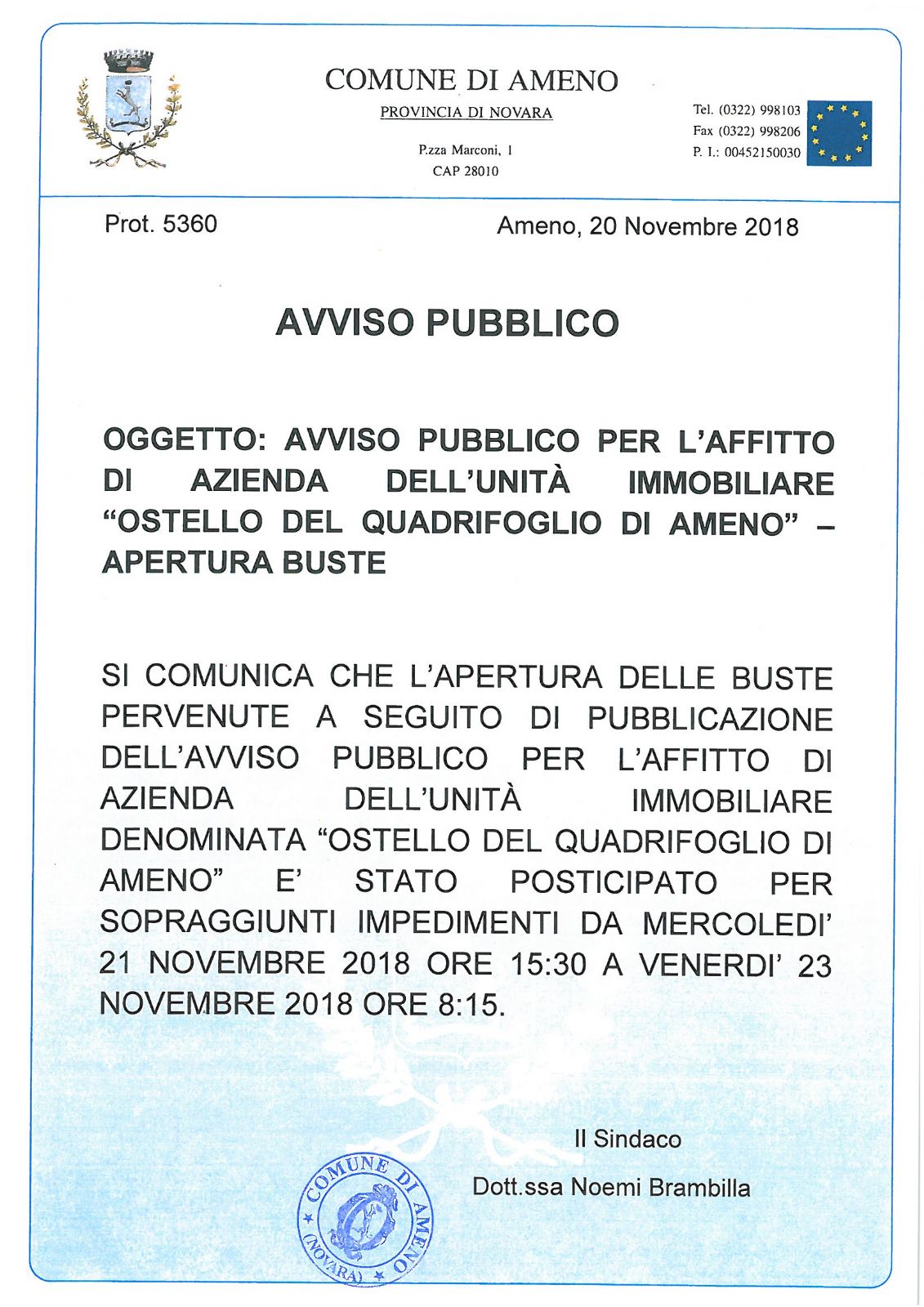 AVVISO PUBBLICO PER L’AFFITTO DI AZIENDA DELL’UNITÀ IMMOBILIARE “OSTELLO DEL QUADRIFOGLIO DI AMENO” – APERTURA BUSTE