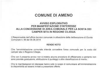 AVVISO ESPLORATIVO PER MANIFESTAZIONE D’INTERESSE ALLA CONCESSIONE DI AREA COMUNALE PER LA SOSTA DEI CAMPER SITA IN REGIONE CILIEGIA.