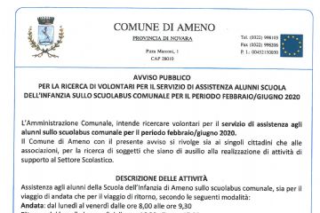 AVVISO PUBBLICO PER LA RICERCA DI VOLONTARI PER IL SERVIZIO DI ASSISTENZA ALUNNI SCUOLA DELL'INFANZIA SULLO SCOLABUS COMUNALE PER IL PERIODO FEBBRAIO/GIUGNO 2020.