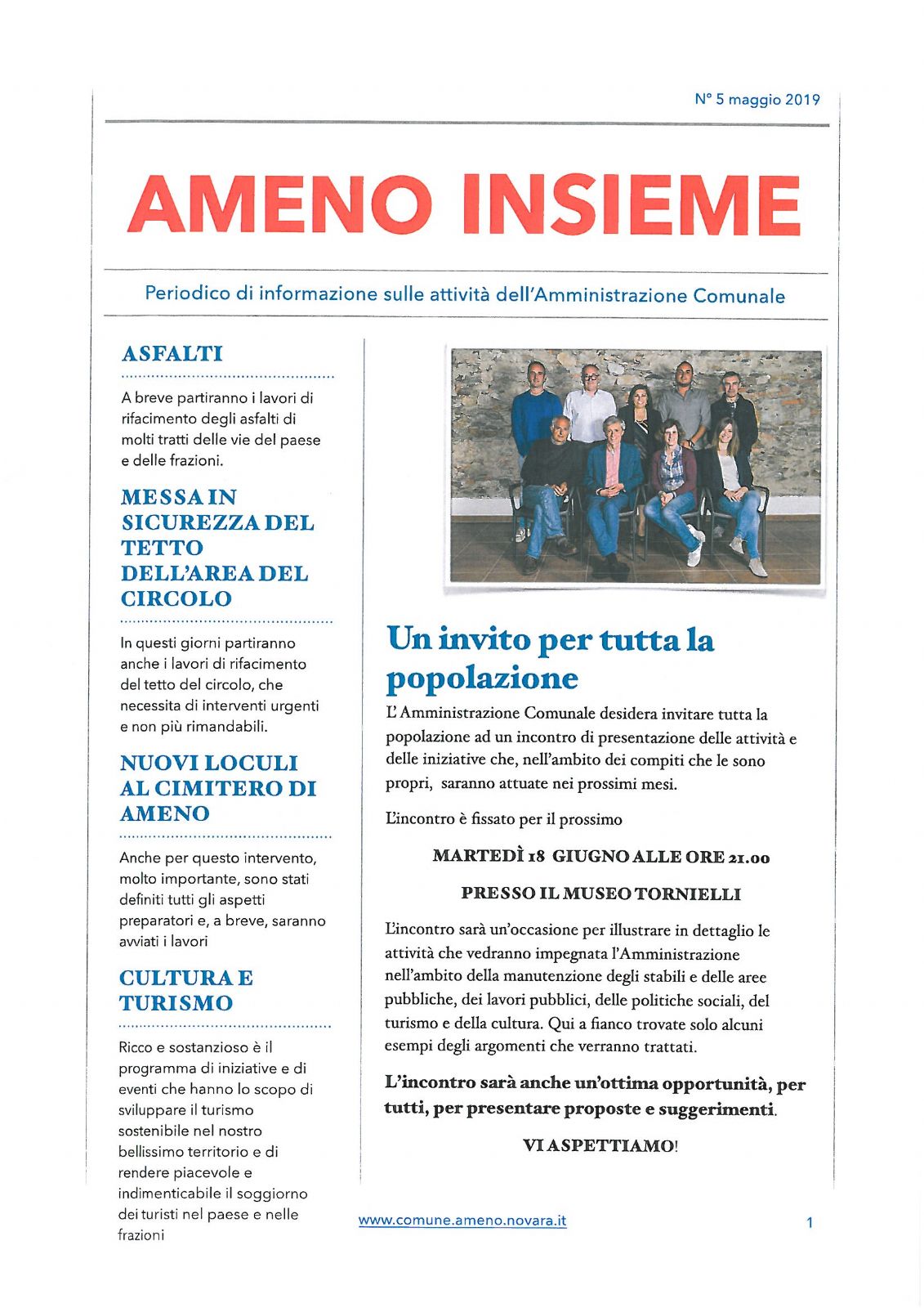 AMENO INSIEME - PERIODICO DI INFORMAZIONE SULLE ATTIVITA' DELL'AMMINISTRAZIONE COMUNALE - MAGGIO 2019