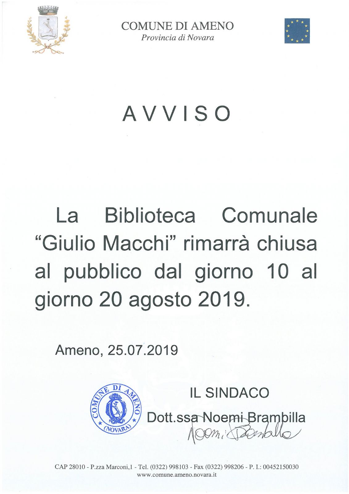 La Biblioteca Comunale "Giulio Macchi" rimarrà chiusa al pubblico dal giorno 10 al giorno 20 agosto 2019.