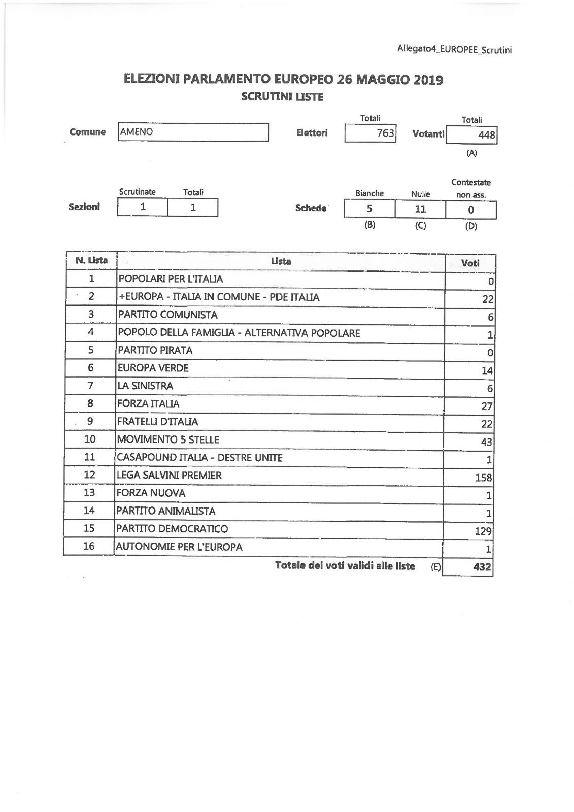 ELEZIONI PARLAMENTO EUROPEO 26 MAGGIO 2019 - SCRUTINI LISTE