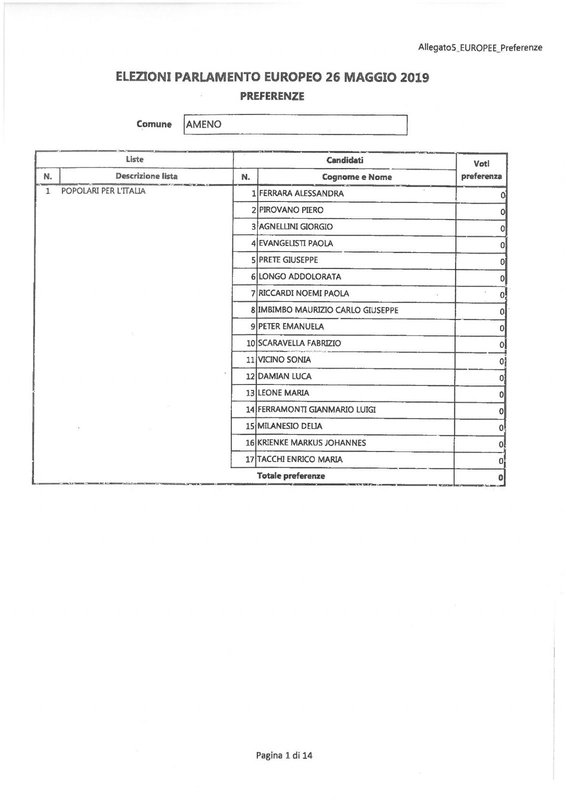 ELEZIONI PARLAMENTO EUROPEO 26 MAGGIO 2019 - PREFERENZE