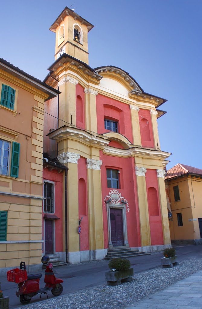 Situata accanto al Municipio, è uno degli edifici barocchi più interessanti della riviera dal punto di vista architettonico per la ricercatezza e raffinatezza delle forme. La chiesa attuale venne edificata alla fine del Seicento come oratorio privato di palazzo Tornielli, su progetto dell’architetto Giovanni Antonio Martelli, sacerdote miasinese e canonico della Basilica di San Giulio, di cui realizzò negli stessi anni l’elegante scurolo di San Giulio. Internamente si vedono appese alle pareti varie tele di dimensioni simili con episodi legati alla vita di San Giovanni Battista dipinte da Giovanni Antonio De Groot (1664-1712), pittore complesso e originale, e due tele opera di Giuseppe Zanatta e Tarquinio Grassi. La grandissima tela che campeggia sulla parete di destra è davvero interessante, soprattutto dal punto di vista storico, poiché raffigura una riunione del Concilio di Trento, cui presenziò, al seguito del vescovo novarese, un sacerdote amenese, Nestore Ferrini, in ricordo del quale venne realizzato il dipinto, donato nel 1680 da alcuni amenesi residenti a Trento. Di tele simili ne esistono solo quattro, quasi identiche tra loro: due si trovano a Trento una a Mantova.